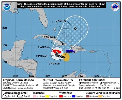 Melissa se convierte en huracán categoría 1 y se acerca a Jamaica: seguirá provocando lluvias en el suroeste dominicano